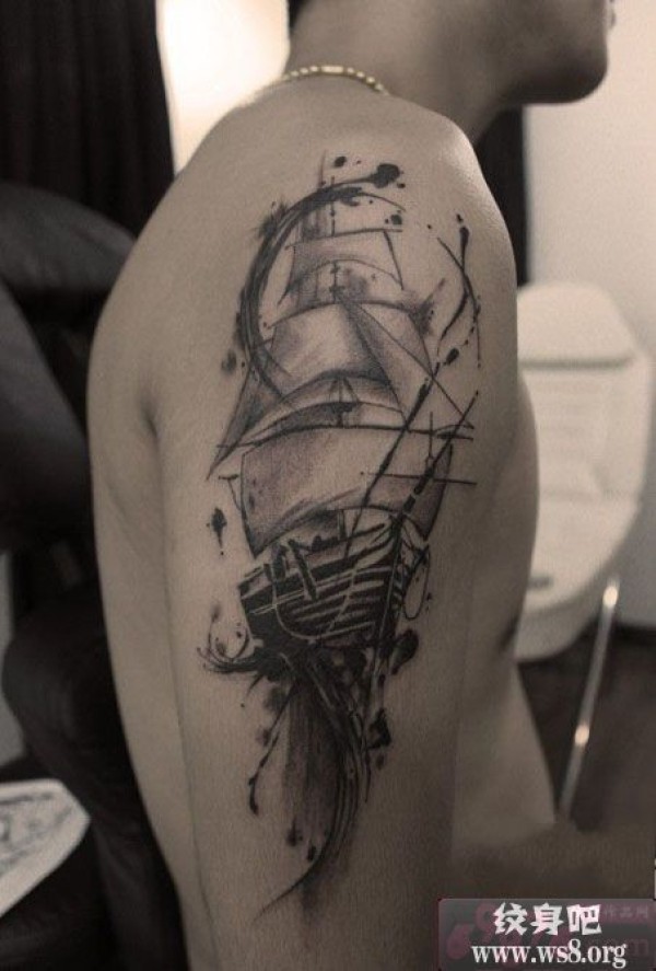 手臂上的水墨风格帆船shuimofenggefanchuan_臂部纹身图案大全_纹身图吧