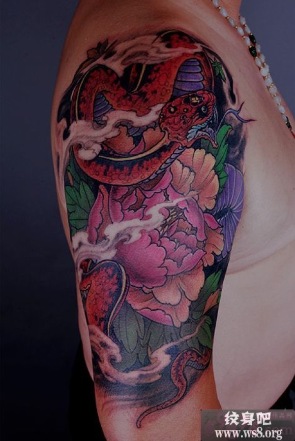 手臂上的蛇与牡丹sheyumudan_臂部纹身图案大全_纹身图吧