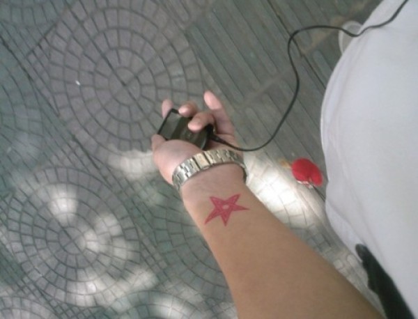 女性手臂红色五角星刺青_臂部纹身图案大全_纹身图吧