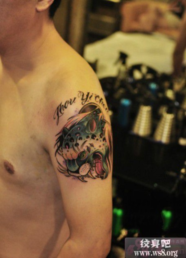 彩色豹子头像霸气手臂纹身图案_臂部纹身图案大全_纹身图吧