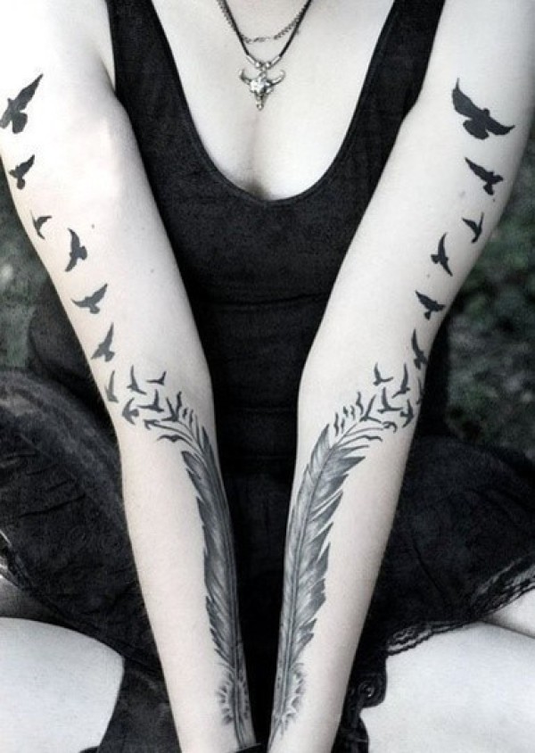 女性手臂羽毛小鸟刺青_臂部纹身图案大全_纹身图吧