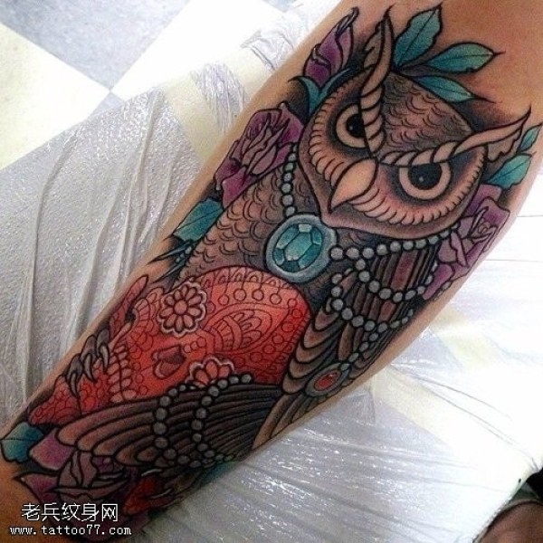手臂彩色猫头鹰纹身图案_臂部纹身图案大全_纹身图吧