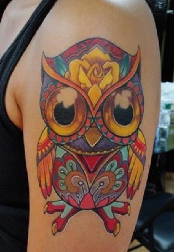 大臂彩色猫头鹰纹身图案图案_臂部纹身图案大全_纹身图吧