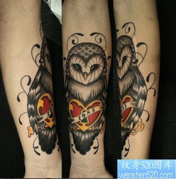 一幅手臂黑灰猫头鹰纹身图片由纹身520图库推荐_臂部纹身图案大全_纹身图吧