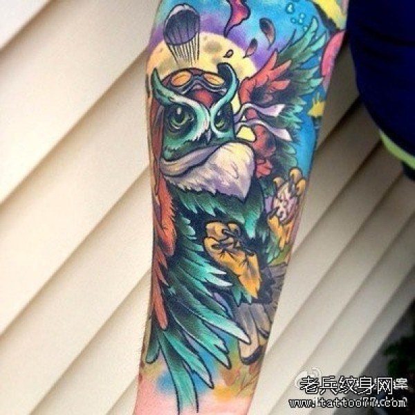 纹身520图库推荐一幅手臂彩色猫头鹰纹身图片_臂部纹身图案大全_纹身图吧