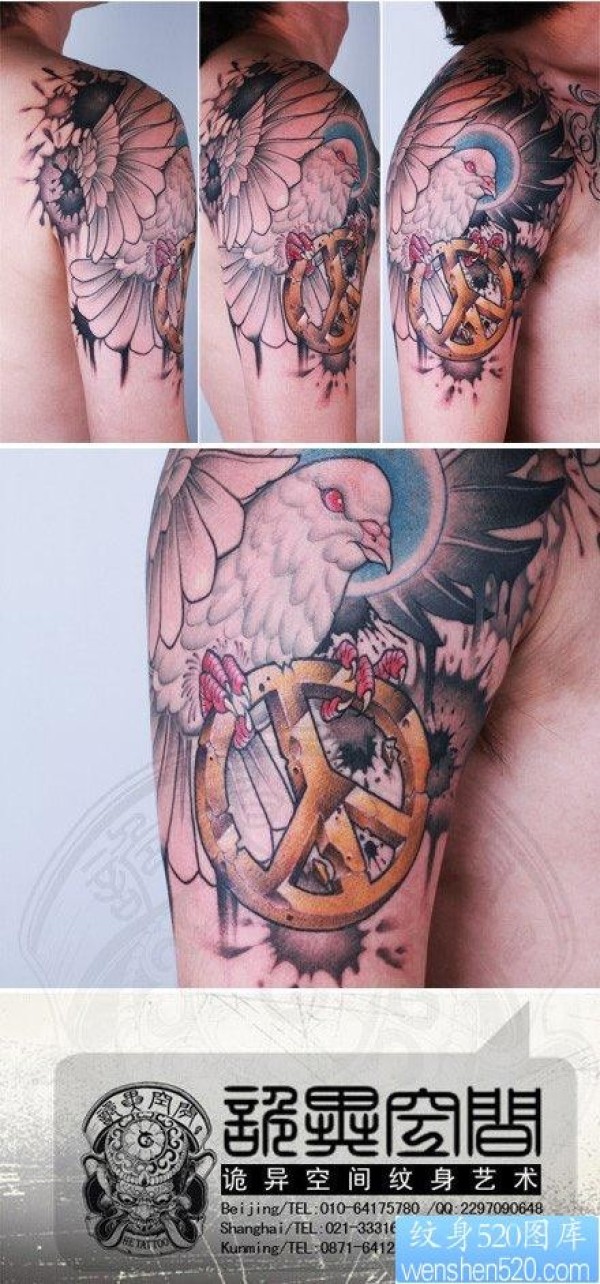 手臂经典很酷的白鸽与反战符号纹身图片_臂部纹身图案大全_纹身图吧