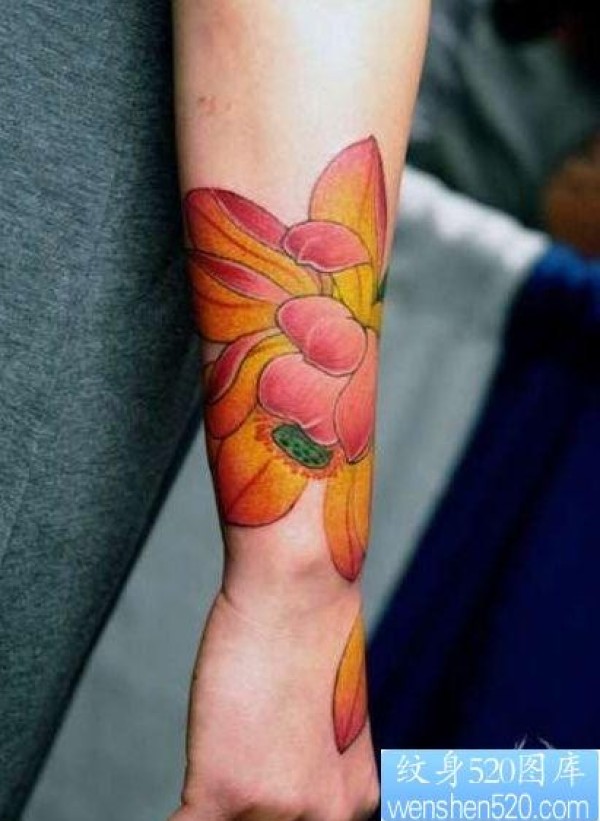 女人手臂精美的彩色莲花纹身图片_臂部纹身图案大全_纹身图吧