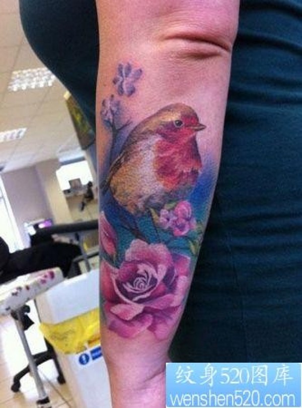 手臂彩色小鸟喜鹊花卉纹身_臂部纹身图案大全_纹身图吧