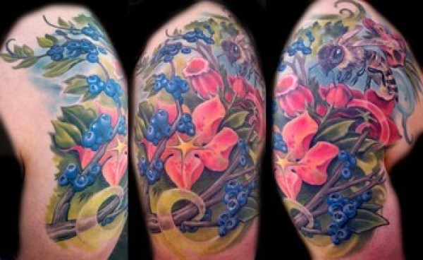 手臂纹身图片大臂的蓝莓蜜蜂纹身图片_臂部纹身图案大全_纹身图吧