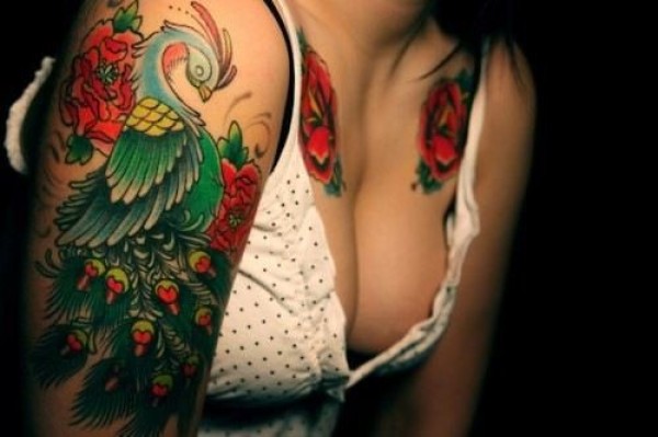 手臂上色彩鲜艳的孔雀图案_臂部纹身图案大全_纹身图吧