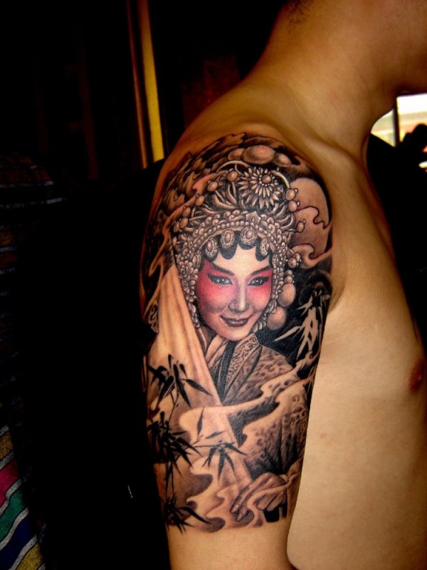 男士上手臂外侧彩色花旦纹身图案_臂部纹身图案大全_纹身图吧