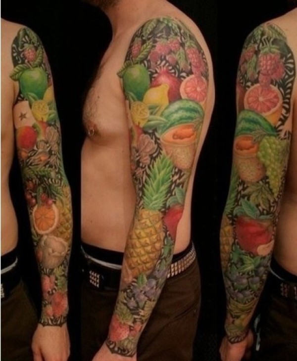 满手臂水果拼图纹身作品常见的水果纹身里都有_臂部纹身图案大全_纹身图吧