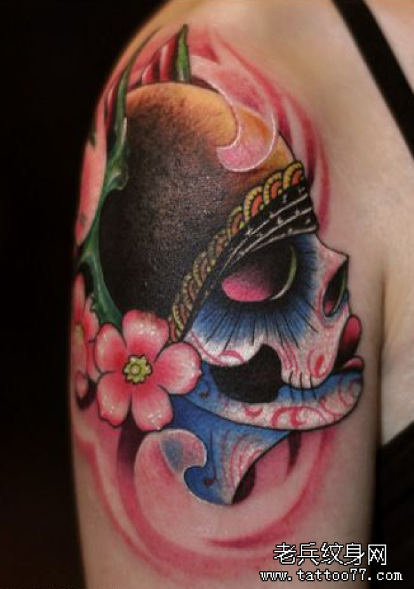 手臂彩色面具樱花纹身图案_臂部纹身图案大全_纹身图吧