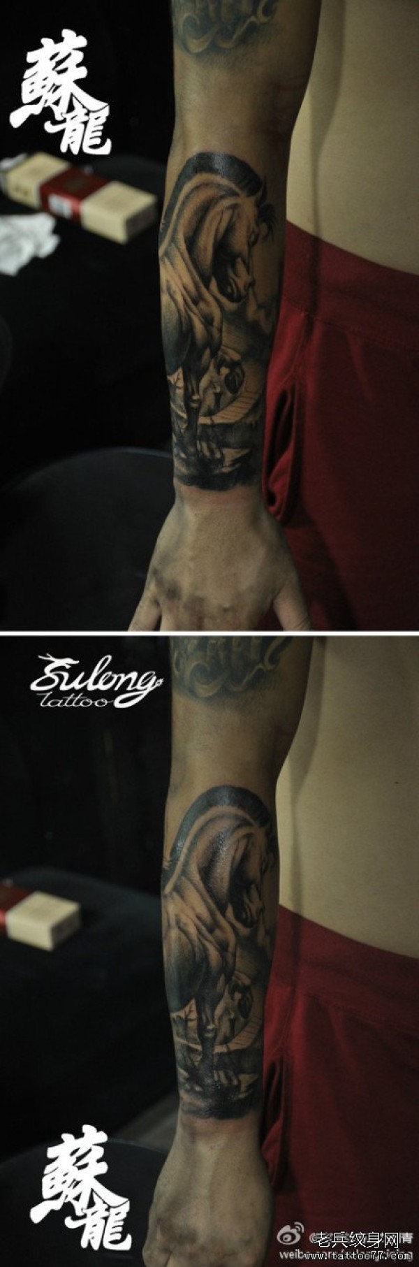 手臂潮流时尚的黑灰马纹身图案_臂部纹身图案大全_纹身图吧