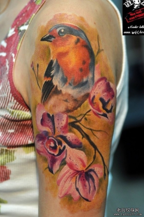 手臂潮流时尚的小鸟与花卉纹身图案_臂部纹身图案大全_纹身图吧