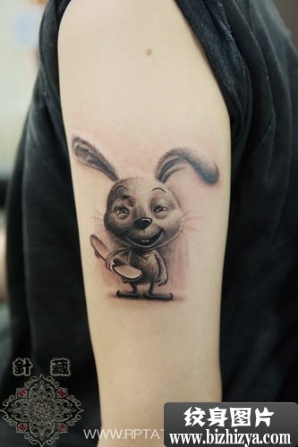 手臂上微笑的长耳兔黑色纹身_臂部纹身图案大全_纹身图吧