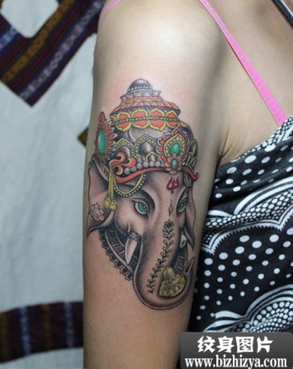 女子右手臂上的象神纹身作品_臂部纹身图案大全_纹身图吧