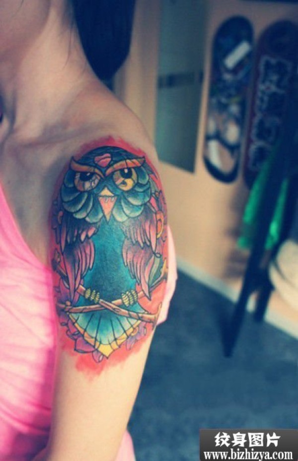 彩绘猫头鹰手臂纹身图案图片_臂部纹身图案大全_纹身图吧