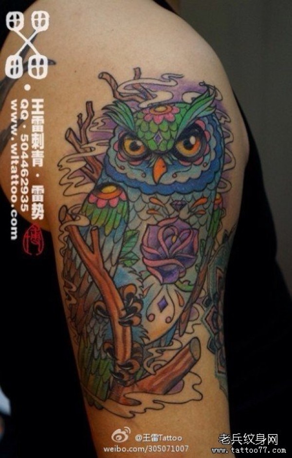手臂时尚很帅的彩色猫头鹰纹身图案_臂部纹身图案大全_纹身图吧