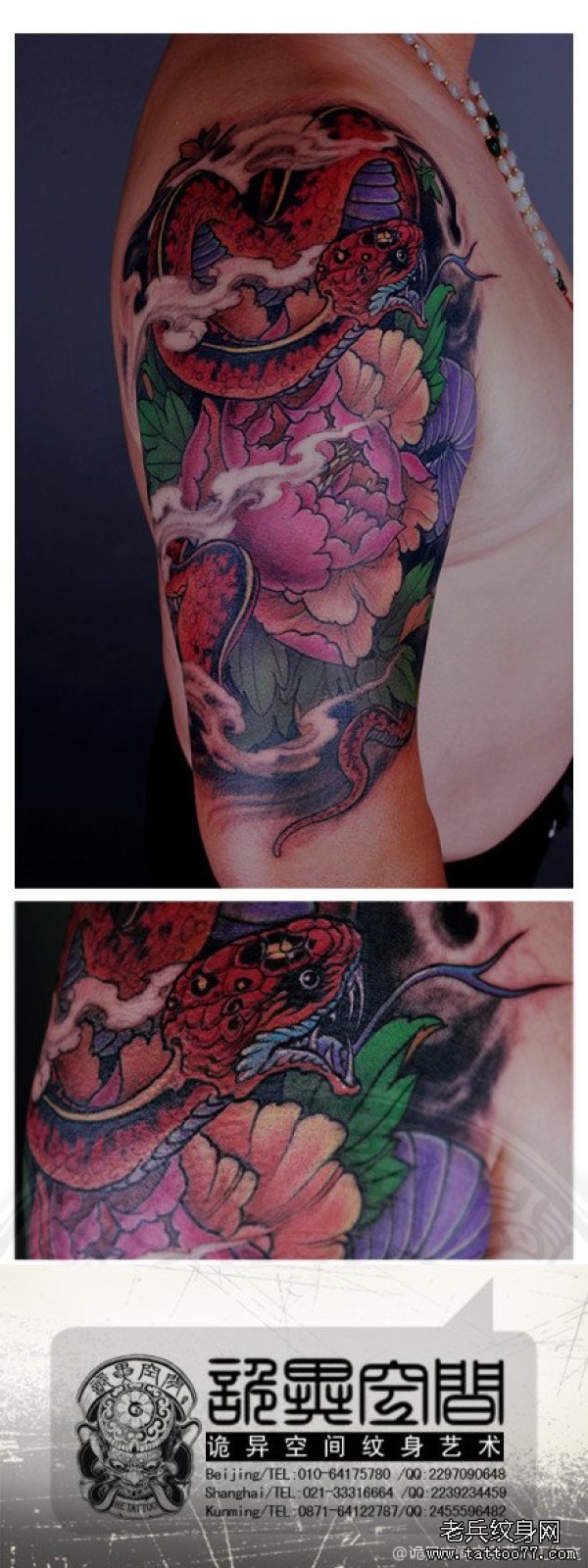 手臂漂亮潮流的彩色蛇与牡丹花纹身图案_臂部纹身图案大全_纹身图吧