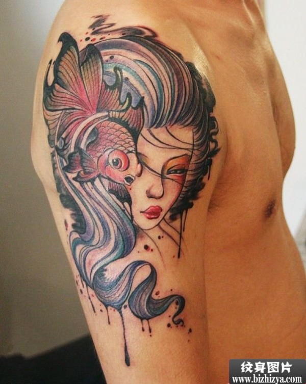 手臂彩绘美女头像鱼纹身图案图片_臂部纹身图案大全_纹身图吧