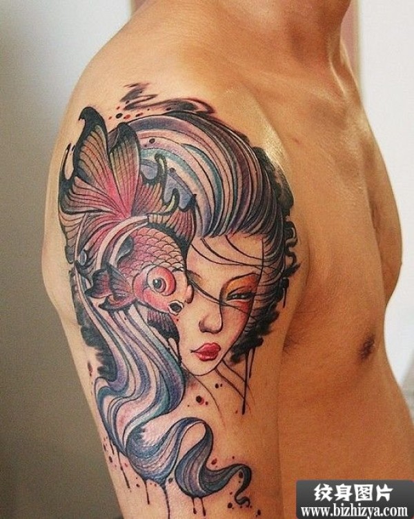 男人大臂上金鱼美女图案图片_臂部纹身图案大全_纹身图吧