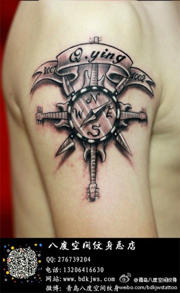 手臂经典潮流的黑灰指南针纹身图案_臂部纹身图案大全_纹身图吧