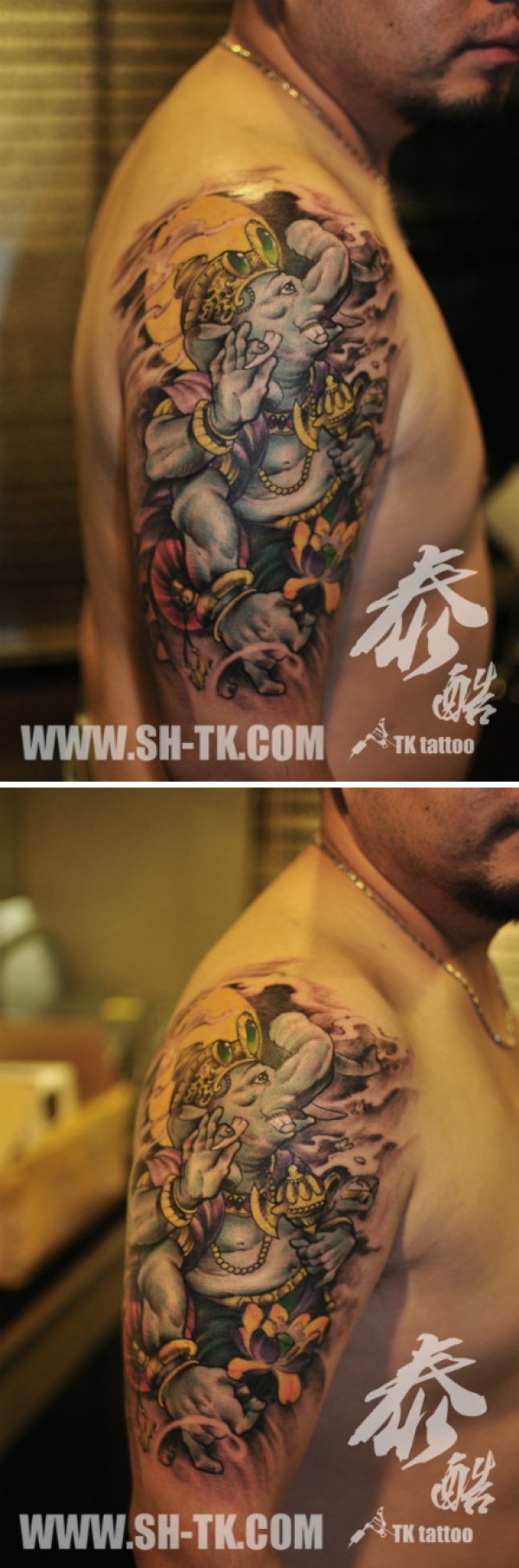手臂潮流很酷的彩色象神纹身图案_臂部纹身图案大全_纹身图吧