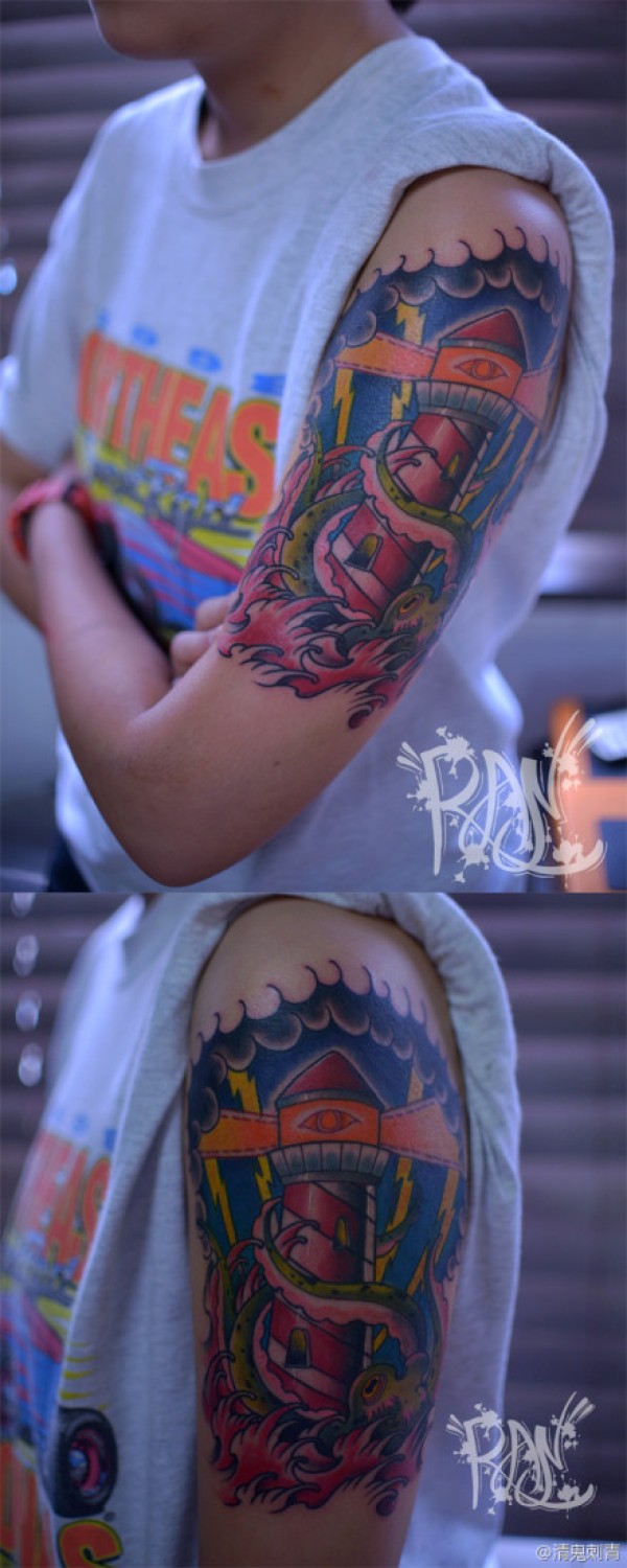 男生手臂时尚很酷的灯塔纹身图案_臂部纹身图案大全_纹身图吧
