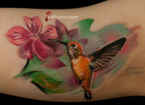 手臂内侧潮流时尚的蜂鸟与花卉纹身图案_臂部纹身图案大全_纹身图吧