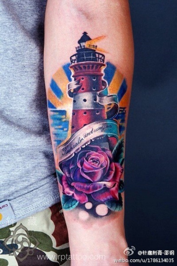 手臂潮流时尚的彩色灯塔纹身图案_臂部纹身图案大全_纹身图吧