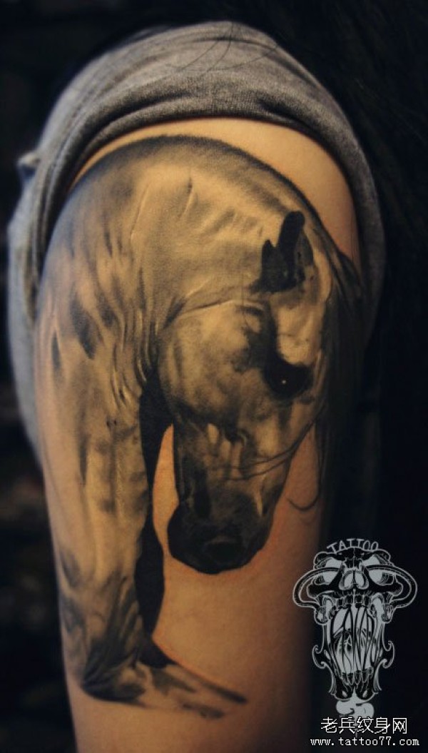 手臂一款黑灰写实的马纹身图案_臂部纹身图案大全_纹身图吧