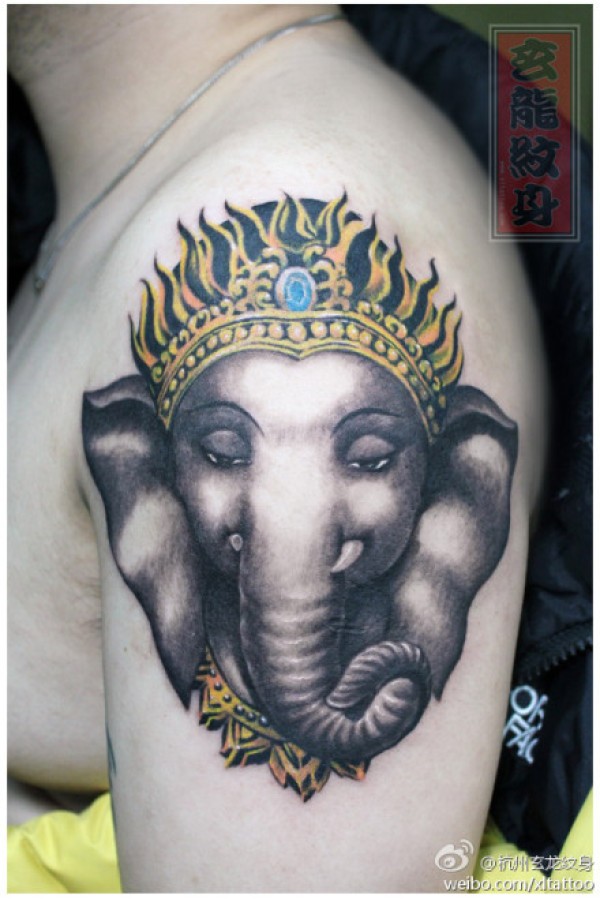 手臂流行经典的黑灰象神纹身图案_臂部纹身图案大全_纹身图吧