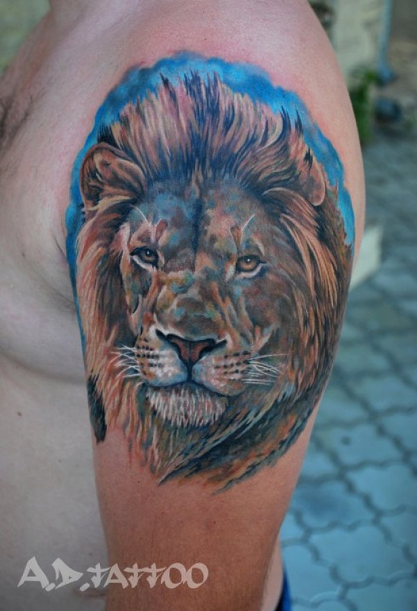 男人手臂精美的水彩画狮头纹身图案_臂部纹身图案大全_纹身图吧