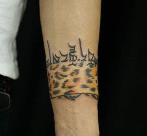 手臂精美的六字真言加豹纹纹身图案_臂部纹身图案大全_纹身图吧