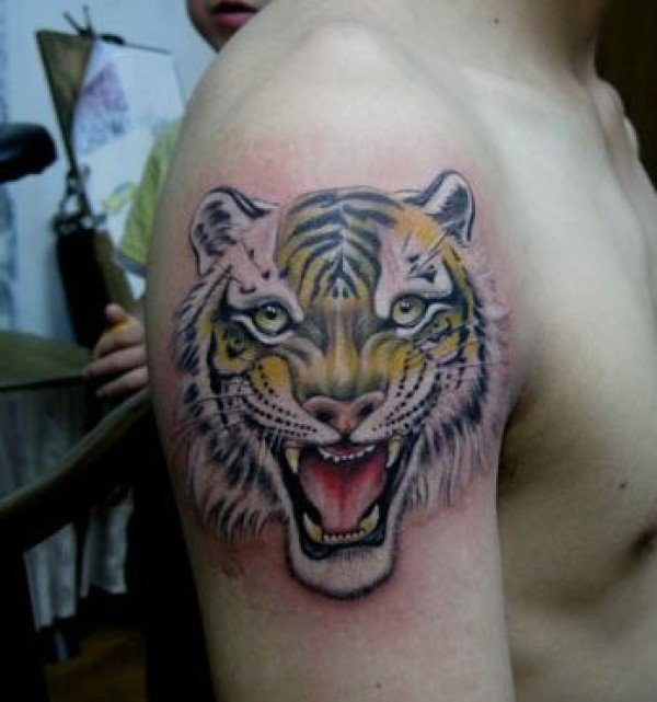 大臂霸气的彩色虎头纹身图案_臂部纹身图案大全_纹身图吧