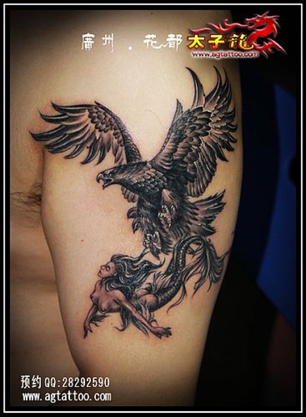 武汉专业纹身店大臂老鹰美人鱼纹身图案图片_臂部纹身图案大全_纹身图吧