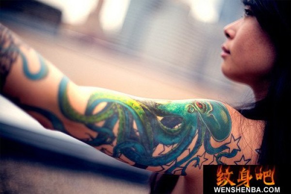 美女手臂蓝色章鱼纹身_臂部纹身图案大全_纹身图吧