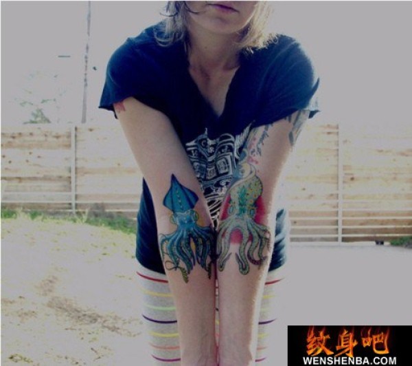 女人手臂彩色章鱼纹身_臂部纹身图案大全_纹身图吧