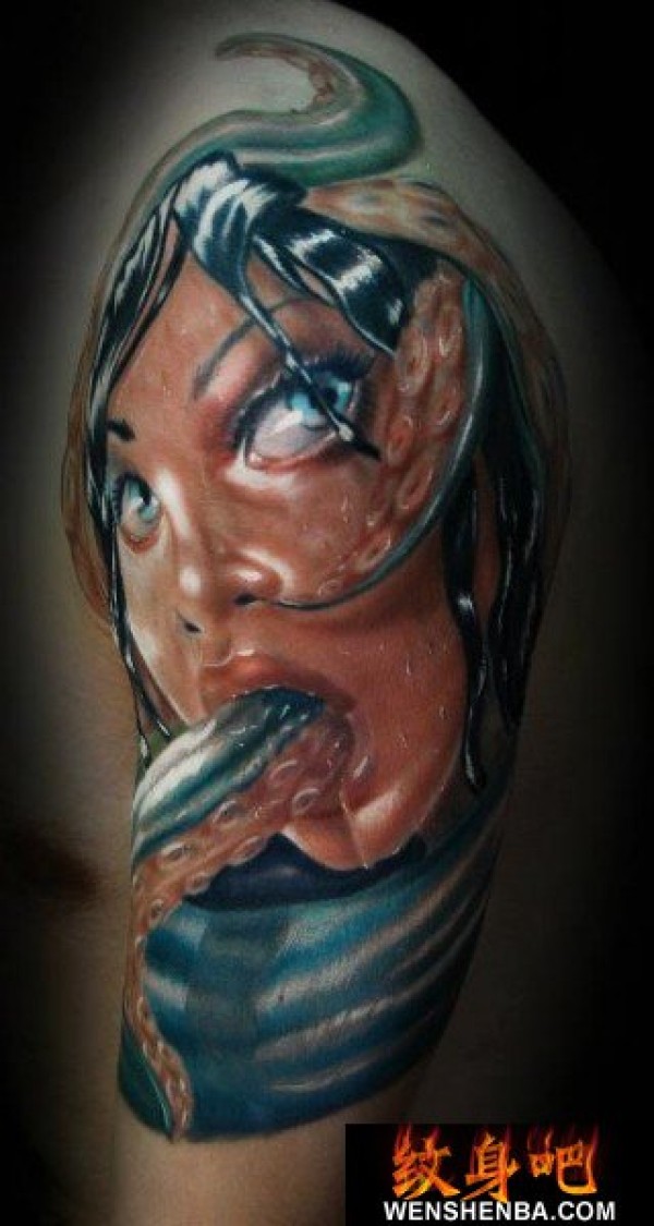 大臂章鱼女郎纹身_臂部纹身图案大全_纹身图吧