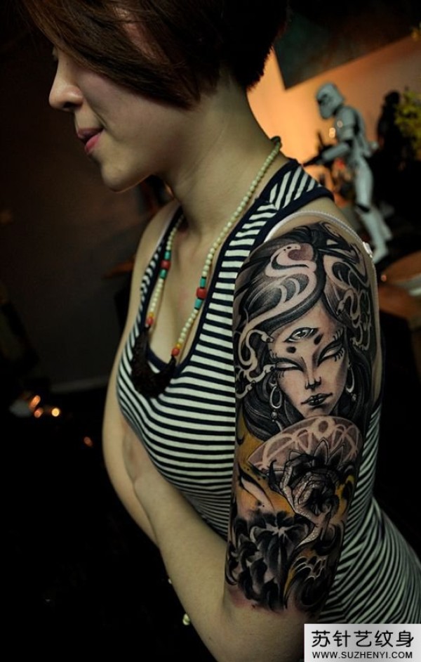 艺妓蛇与花创意手臂纹身_臂部纹身图案大全_纹身图吧