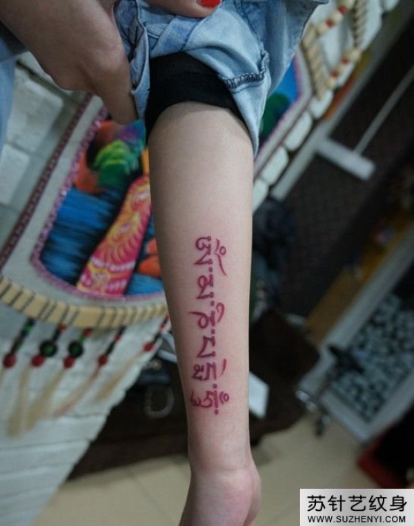 红色个性藏文六字真言手臂纹身_臂部纹身图案大全_纹身图吧