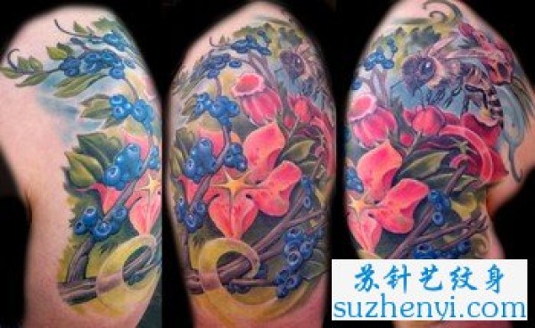 大臂的蓝莓蜜蜂纹身_臂部纹身图案大全_纹身图吧