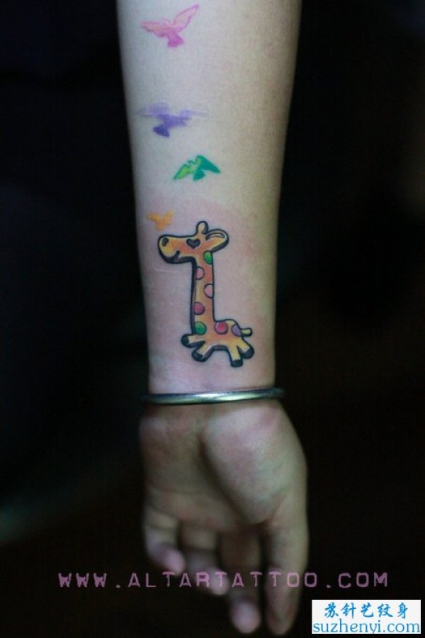 手臂彩色小鹿与小鸟纹身_臂部纹身图案大全_纹身图吧