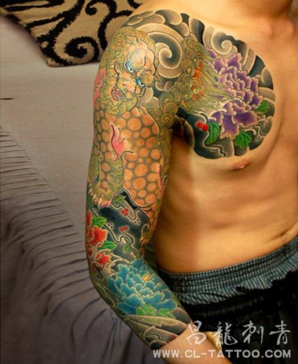 唐狮半胛七分臂_男士大图_臂部纹身图案大全_纹身图吧