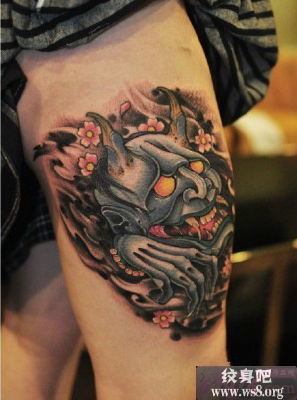 腿部帅气潮流的彩色般若纹身图案_般若纹身图案大全_纹身图吧