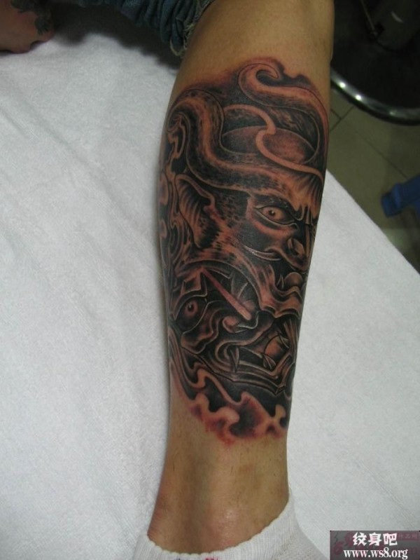 男人腿部经典帅气的黑灰般若纹身图案_般若纹身图案大全_纹身图吧