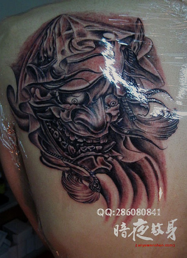 男人后肩背时尚经典的黑灰般若纹身图案_般若纹身图案大全_纹身图吧