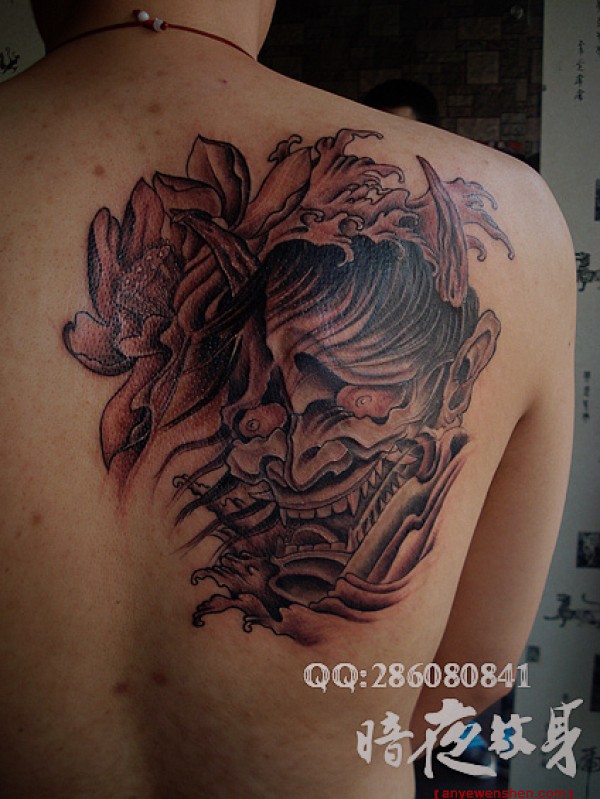 男人后肩背时尚经典的黑灰般若纹身图案_般若纹身图案大全_纹身图吧