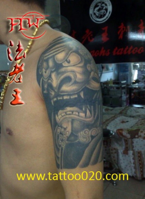 男人后肩背时尚经典的黑灰般若纹身图案_般若纹身图案大全_纹身图吧